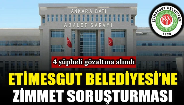 CHP'li Ankara Etimesgut Belediyesi hakkında başlatılan 'zimmet' soruşturmasında sabah saatlerinde dört kişi gözaltına alındı. Ankara Batı Cumhuriyet Başsavcılığı tarafından yapılan açıklamada "Sayıştay denetimlerinde Etimesgut Belediyesi ile iştiraki Etimkent A.Ş.’nin hesaplarında tespit edilen usulsüzlüklere ilişkin 'Zimmet' suçundan başlatılan soruşturma kapsamında 4 şüphelinin gözaltına alındığı" bildirildi.