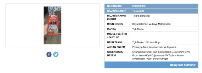 Yapılan teknik incelemeler ve laboratuvar testleri sonucunda, “Tuğba İç ve Dış Ticaret - Mehmet Kalınkara” firması tarafından piyasaya sürülen “ Tgb Marka 12’li Kuru Boya” setinde ciddi sağlık riskleri saptandı. Oyuncak Güvenliği Yönetmeliği ile ilgili TS EN standartları çerçevesinde yürütülen denetimlerde, söz konusu ürünün içeriğinde Krom III ve Krom VI geçişinin bulunduğu tespit edildi. Ayrıca yapılan analizlerde üründeki toplam kurşun miktarının da mevzuatla belirlenen yasal limitlerin üzerinde olduğu resmi olarak kayıtlara geçti.