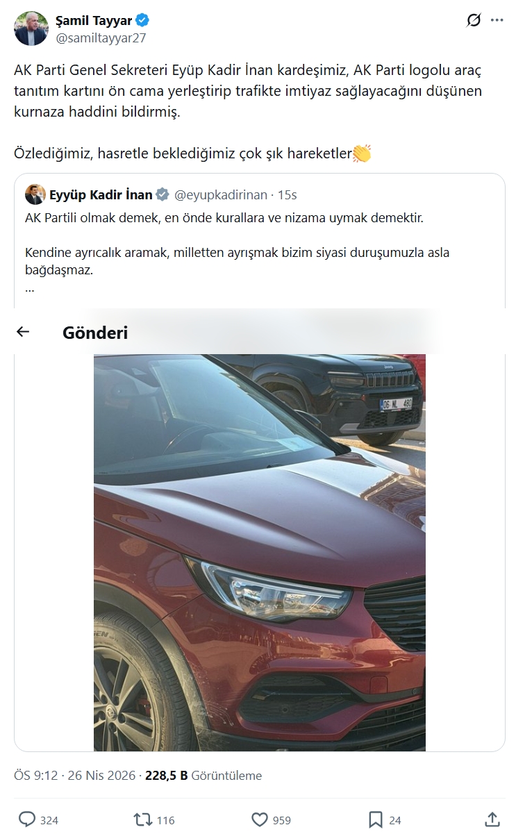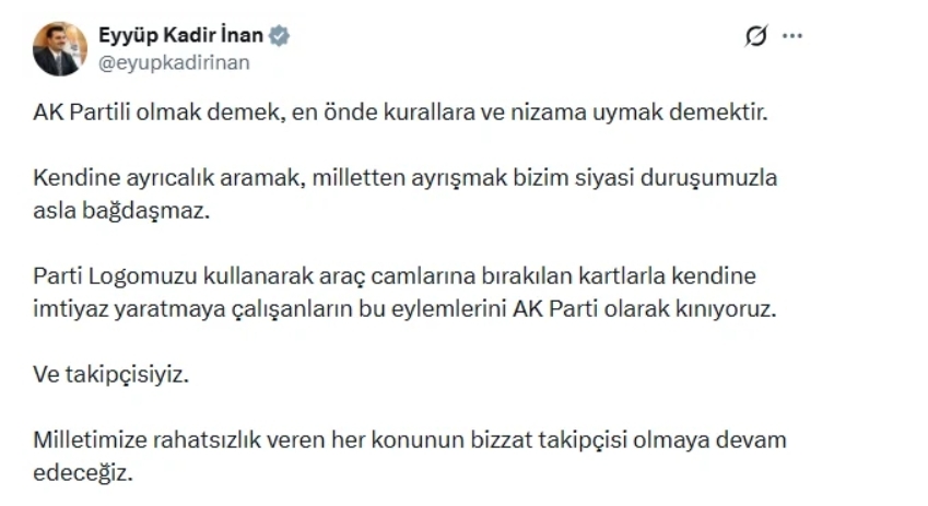 Sosyal medya hesabından ön camında AK Parti logolu kart bulunan bir aracın görüntüsünü paylaşan Eyyüp Kadir İnan, “AK Partili olmak demek, en önde kurallara ve nizama uymak demektir. Kendine ayrıcalık aramak, milletten ayrışmak bizim siyasi duruşumuzla asla bağdaşmaz” ifadelerini kullandı.