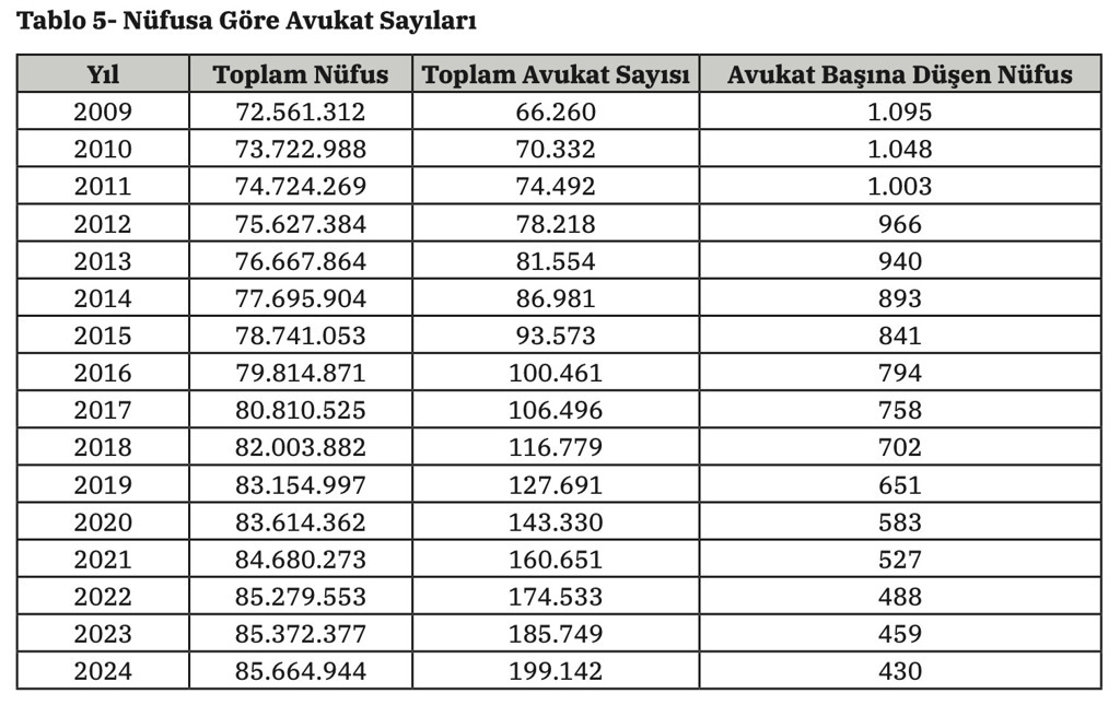 Toplum Çalışmaları Enstitüsü, 2024 yılı itibarıyla Türkiye’de 200 bin avukatın olduğunu ve avukat başına da 430 kişinin düştüğünü ortaya koydu. Söz konusu raporla eğitimde kalite ve istihdam tartışması masaya yatırıldı.