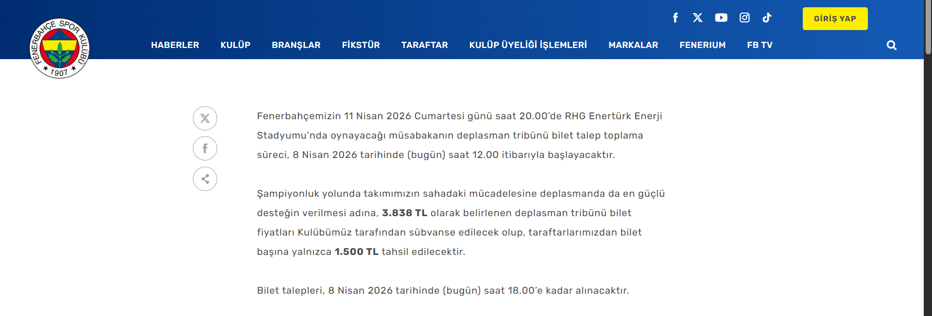 Sarı-lacivertli kulübün resmi internet sitesi üzerinden yayımlanan yazılı açıklamada, sürecin detaylarına dair şu ifadelere yer verildi: "Fenerbahçemizin 11 Nisan 2026 Cumartesi günü saat 20.00’de Kayseri'de oynayacağı müsabakanın deplasman tribünü bilet talep toplama süreci, 8 Nisan 2026 tarihinde (bugün) saat 12.00 itibarıyla başlayacaktır. Şampiyonluk yolunda takımımızın sahadaki mücadelesine deplasmanda da en güçlü desteğin verilmesi adına, 3 bin 838 TL olarak belirlenen deplasman tribünü bilet fiyatları Kulübümüz tarafından sübvanse edilecek olup, taraftarlarımızdan bilet başına yalnızca bin 500 TL tahsil edilecektir. Bilet talepleri, 8 Nisan 2026 tarihinde (bugün) saat 18.00’e kadar alınacaktır."