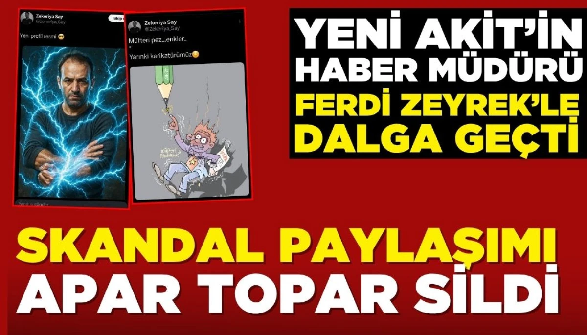 Ferdi Zeyrek için attığı haber manşeti günlerdir tartışılan Yeni Akit Gazetesi'nin haber müdürü Zekeriya Say, sosyal medyadan ahlaki değerlerimize, örf ve adetlerimize sığmayacak bir paylaşım yaptı. Zekeriya Say ilk paylaşımında kalem üzerinde elektrik dalgalarıyla hazırlanmış fotoğrafa küfür içerikli bir yazı yazdı. Akit önünde eylem yapanlara 'Müfteri pez....kler" dedi. Ardından bir paylaşım daha yapan Akit Haber Müdürü Zekeriya Say, elektrik efektli bir görselini paylaşarak Ferdi Zeybek göndermesi yaptı. Say'ın bu paylaşımları kamuoyunda büyük tepkiyle karşılanırken Zekeriya Say gelen tepkiler üzerine apar topar bu paylaşımları kaldırdı.  İşte o skandal paylaşımlar: