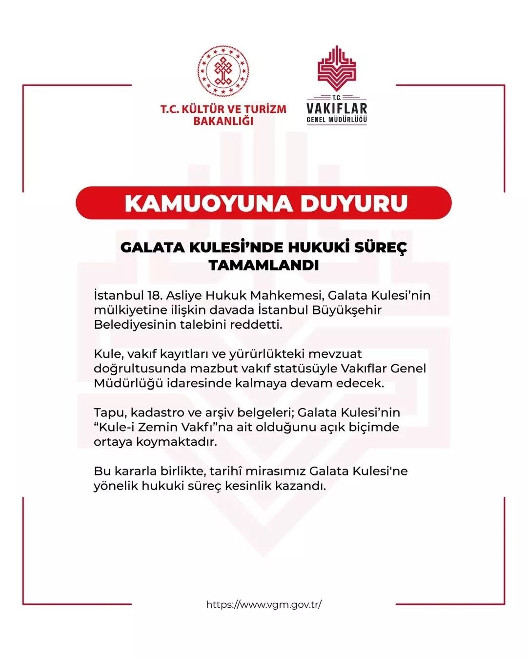 Konuyla ilgili açıklama yapan Vakıflar Genel Müdürlüğü, “İstanbul 18'inci Asliye Hukuk Mahkemesi, Galata Kulesi’nin mülkiyetine ilişkin davada İstanbul Büyükşehir Belediyesi’nin talebini reddetti. Kule, vakıf kayıtları ve yürürlükteki mevzuat doğrultusunda mazbut vakıf statüsüyle Vakıflar Genel Müdürlüğü idaresinde kalmaya devam edecek. apu, kadastro ve arşiv belgeleri; Galata Kulesi'nin Kule-i Zemin Vakfı'na ait olduğunu açık biçimde ortaya koymaktadır. Bu kararla birlikte, tarihi mirasımız Galata Kulesi’ne yönelik hukuki süreç netlik kazandı” ifadelerini kullandı.