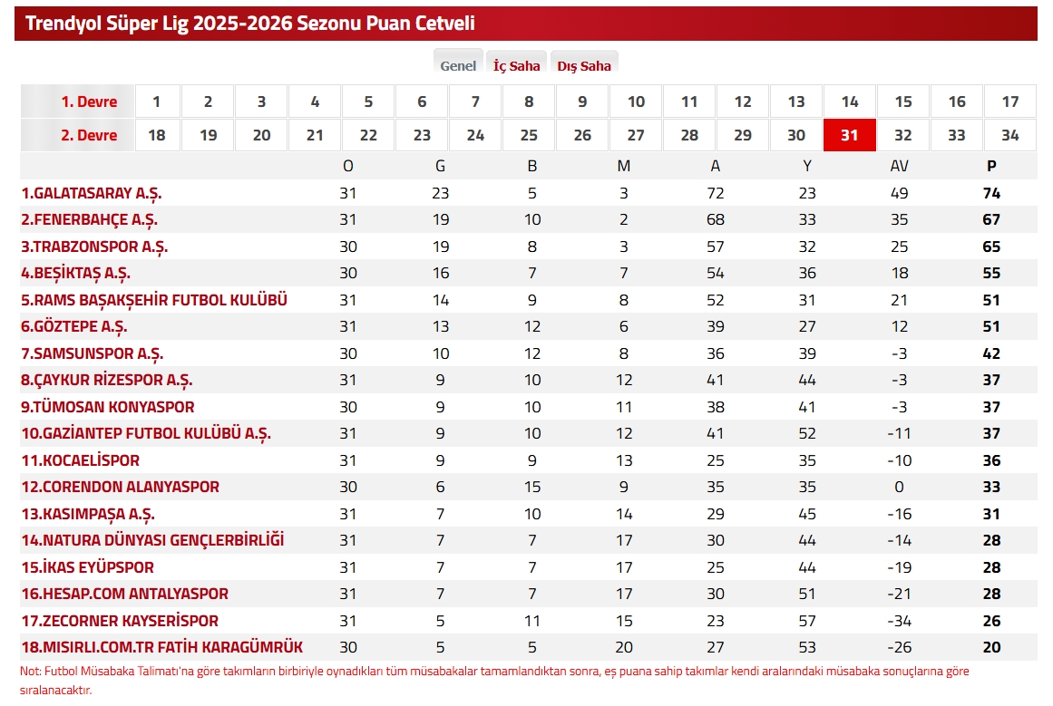 Fenerbahçe ile arasındaki puan farkını 7’ye yükselten sarı kırmızılılar, bir maç fazlasıyla Trabzonspor’un da 9 puan önünde yer alıyor.