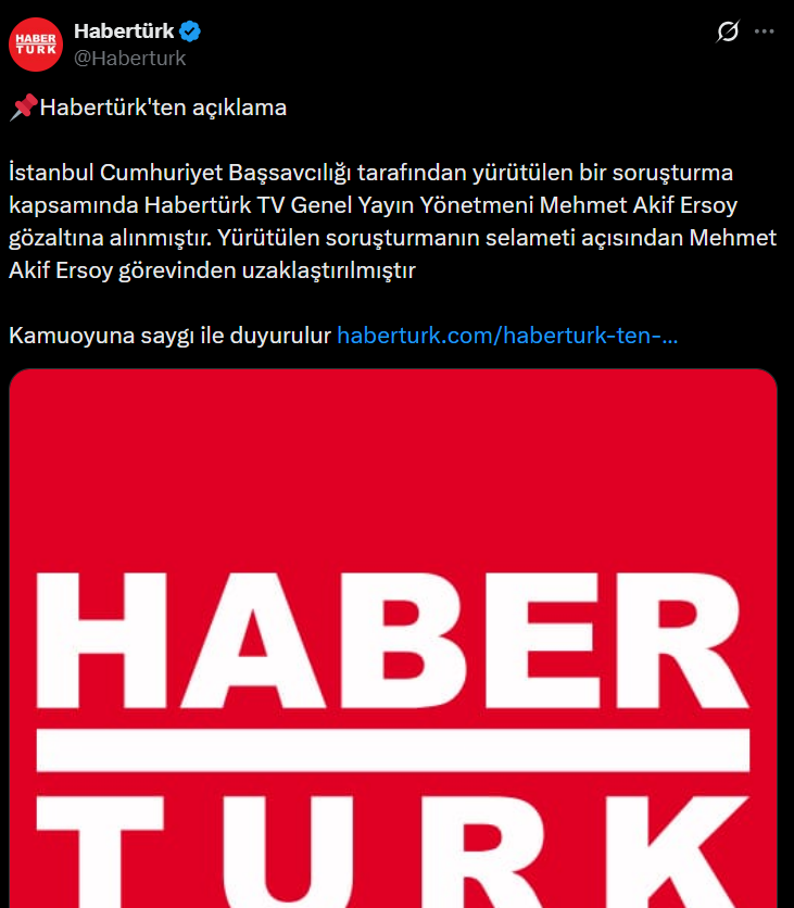 " İstanbul Cumhuriyet Başsavcılığı tarafından yürütülen bir soruşturma kapsamında Habertürk TV Genel Yayın Yönetmeni Mehmet Akif Ersoy gözaltına alınmıştır. Yürütülen soruşturmanın selameti açısından Mehmet Akif Ersoy görevinden uzaklaştırılmıştır. Kamuoyuna saygı ile duyurulur"
