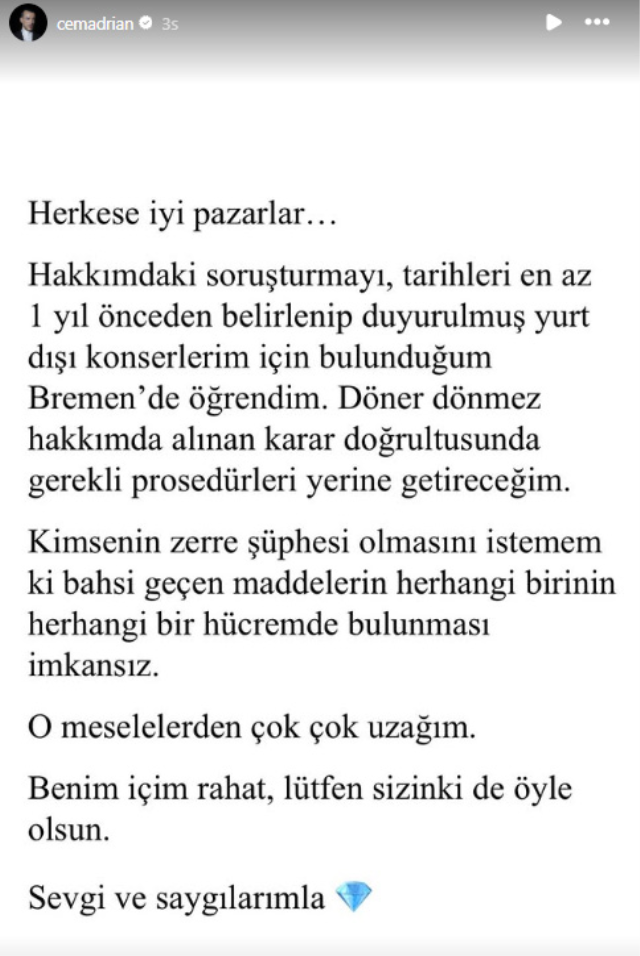 Hakkındaki gözaltı kararının ardından sosyal medya hesabından açıklama yapan Cem Adrian, “Herkese iyi pazarlar… Hakkımdaki soruşturmayı, tarihleri en az 1 yıl önceden belirlenip ve duyurulmuş yurt dışı konserlerim için bulunduğum Bremen’de öğrendim. Döner dönmez hakkımda alınan karar doğrultusunda gerekli prosedürleri yerine getireceğim" ifadeleri yer aldı.