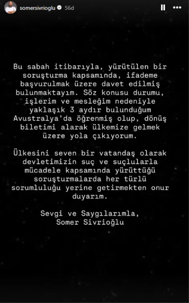 Gözaltı kararı verilen ünlü şef Somer Sivrioğlu sosyal medya hesabından yaptığı açıklamada, "Bu sabah itibarıyla, yürütülen bir soruşturma kapsamında, ifademe başvurulmak üzere davet edilmiş bulunmaktayım. Söz konusu durumu, işlerim ve mesleğim nedeniyle yaklaşık 3 aydır bulunduğum Avustralya’da öğrenmiş olup, dönüş biletimi alarak ülkemize gelmek üzere yola çıkıyorum. Ülkesini seven bir vatandaş olarak devletimizin suç ve suçlularla mücadele kapsamında yürüttüğü soruşturmalarda her türlü sorumluluğu yerine getirmekten onur duyarım" dedi.