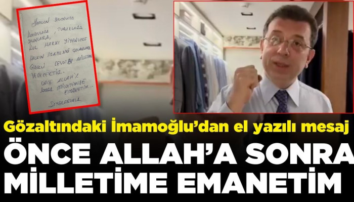 Sabah saatlerinde şafak operasyonuyla gözaltına alınan İstanbul Büyükşehir Belediye Başkanı Ekrem İmamoğlu, Vatan Emniyet'ten el yazısı ile yazdığı bir mesajı paylaştı