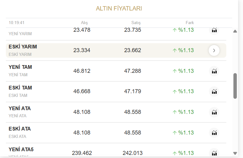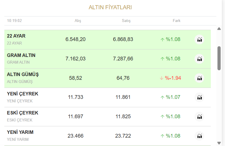 Serbest piyasada gram altın yüzde 1,18 artışla alışı 6.981,64 TL’den işlem görürken, Kapalıçarşı’da alışı 7.162,03 TL’den işlem görüyor. Çeyrek altın ise serbest piyasada 11.733,00 TL’den alınırken, 11.861 TL’ye satılıyor.