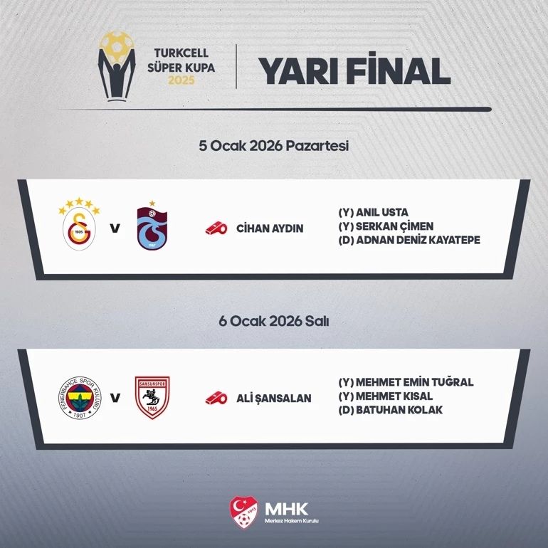 Hakemler belli oldu! Süper Kupa yarı final maçlarını yönetecekler