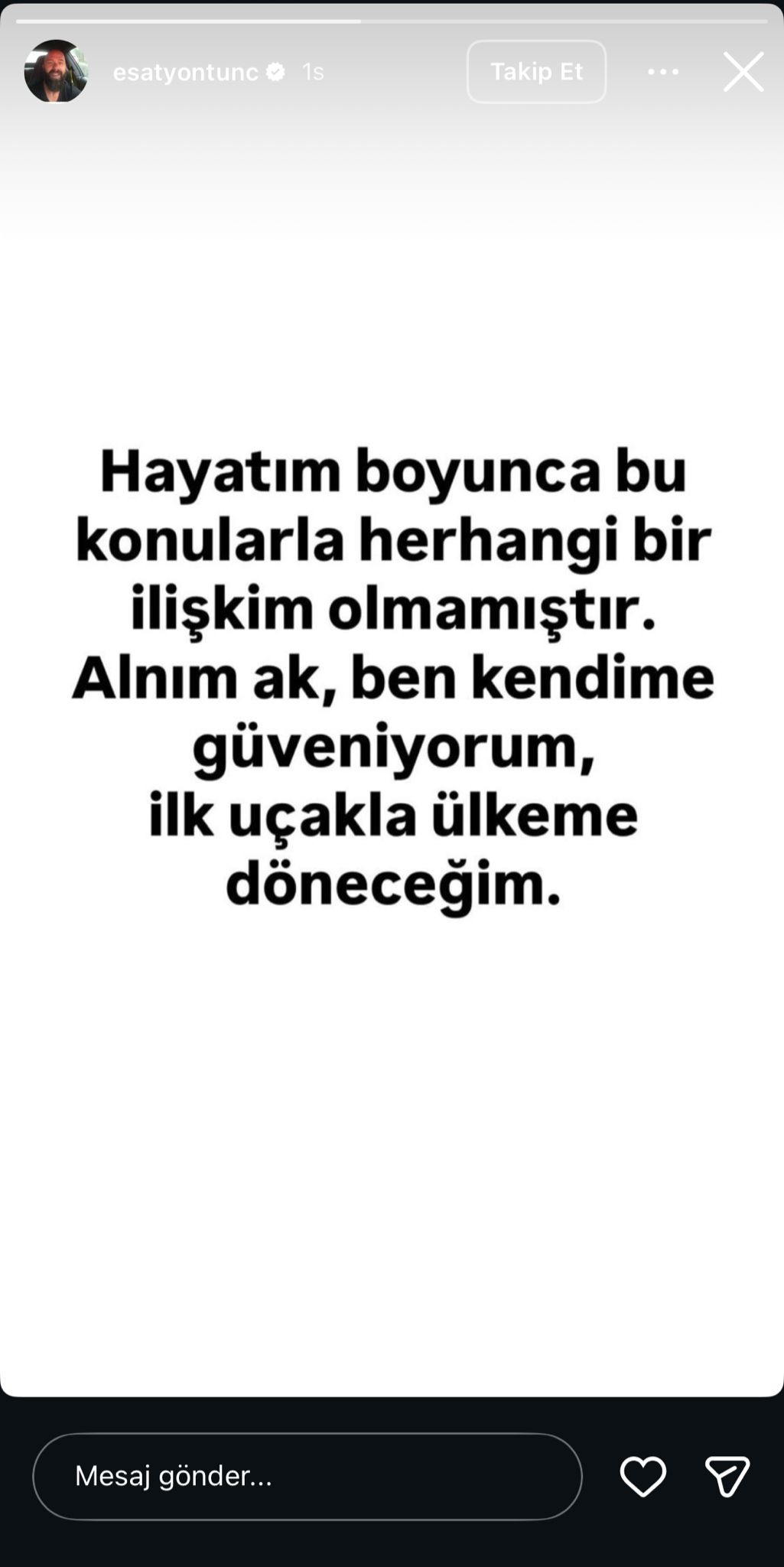 Esat Yontuç'tan yakalama kararı sonrası ilk açıklamayı geldi. Tunç sosyal medya hesabından yaptığı paylaşımda, "Hayatım boyunca bu konularla herhangi bir ilişkim olmamıştır. Alnım ak, ben kendime güveniyorum. İlk uçakla döneceğim" ifadelerini kullandı.