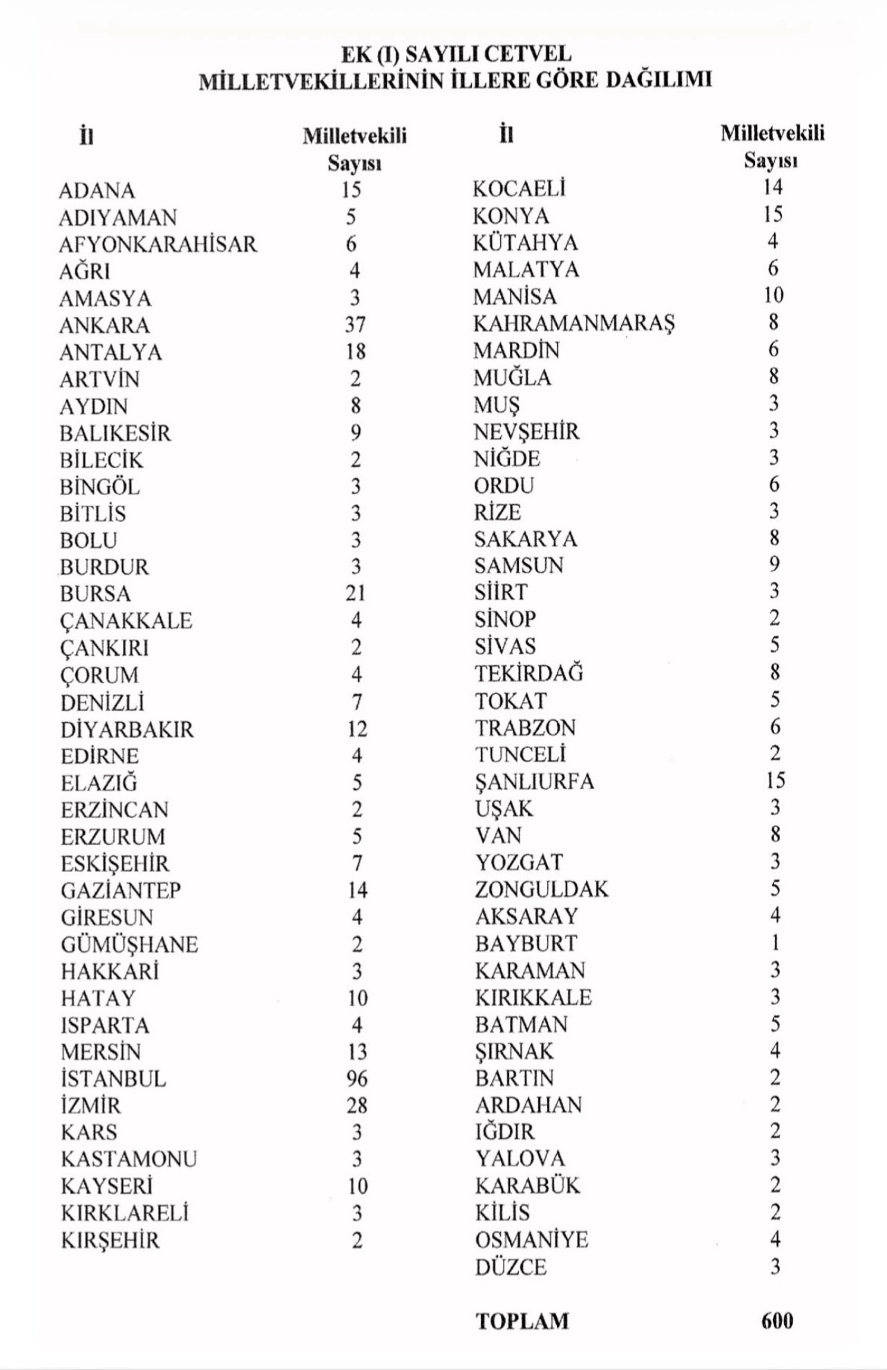 Yeni düzenlemeye göre İstanbul'un milletvekili sayısı 2 azaldı ve 96’ya düştü. Öte yandan Ankara, Bursa, Şanlıurfa, Muğla ve Eskişehir'in milletvekili sayısı 1 arttı.