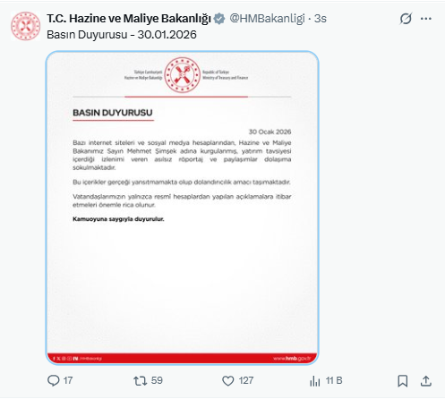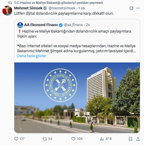 Hazine ve Maliye Bakanlığından dolandırıcılık amaçlı paylaşımlara ilişkin yaptığı uyarıda, “Bazı internet siteleri ve sosyal medya hesaplarından, Hazine ve Maliye Bakanımız Mehmet Şimşek adına kurgulanmış, yatırım tavsiyesi içerdiği izlenimi veren asılsız röportaj ve paylaşımlar dolaşıma sokulmaktadır. Bu içerikler gerçeği yansıtmamakta olup dolandırıcılık amacı taşımaktadır” dedi.