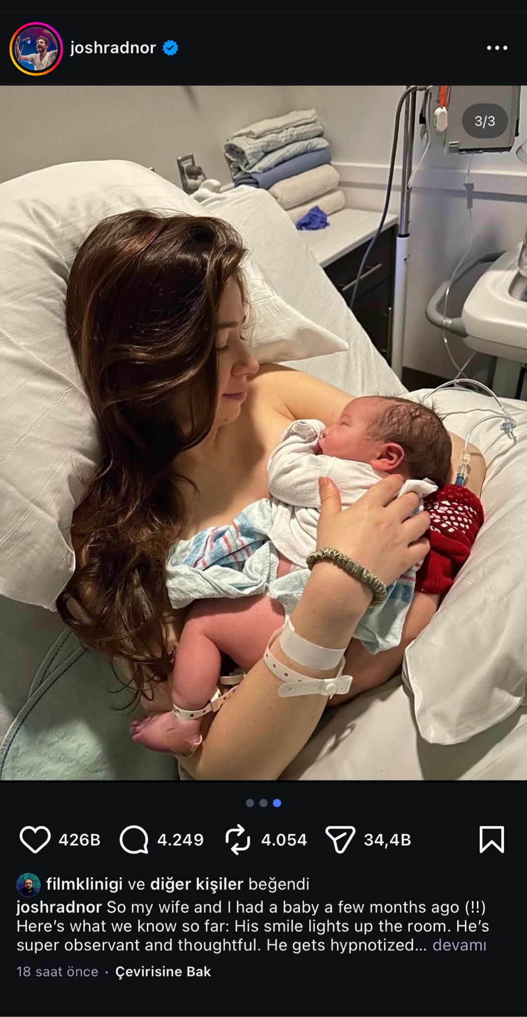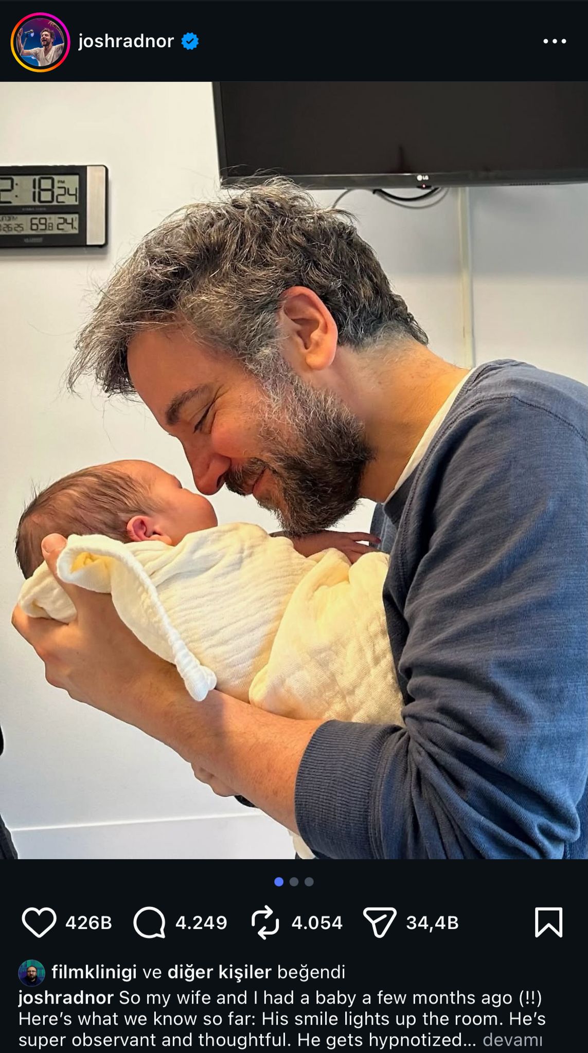 Radnor, “Eşim ve ben birkaç ay önce bir bebek sahibi olduk. Şimdiye kadar bildiklerimiz şunlar: Gülümsemesi odayı aydınlatıyor” diyerek mutluluğunu paylaştı.