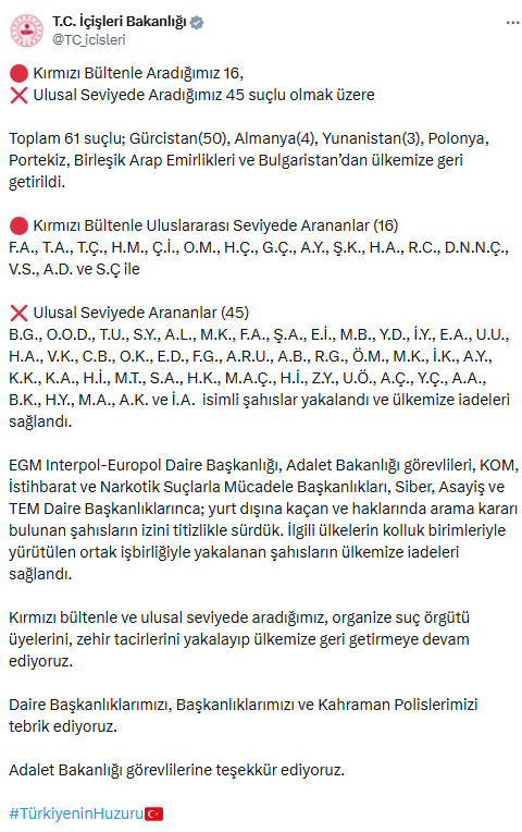 İçişleri Bakanlığı tarafından yapılan açıklamada, "Kırmızı bültenle aradığımız 16, Ulusal seviyede aradığımız 45 suçlu olmak üzere toplam 61 suçlu ülkemize geri getirildi" ifadeleri yer aldı.