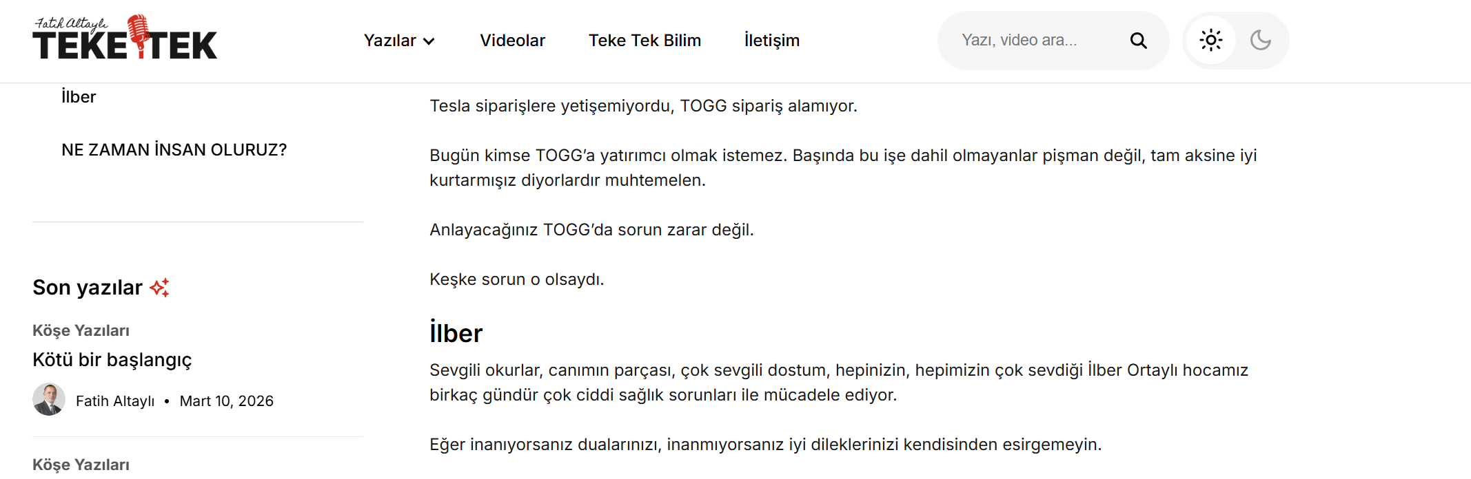 İlber Ortaylı'nın son günlerde ciddi sağlık sorunları yaşadığını yazısında paylaşan Gazeteci Fatih Altaylı, “Sevgili okurlar, canımın parçası, çok sevgili dostum, hepinizin, hepimizin çok sevdiği İlber Ortaylı hocamız birkaç gündür çok ciddi sağlık sorunları ile mücadele ediyor. Eğer inanıyorsanız dualarınızı, inanmıyorsanız iyi dileklerinizi kendisinden esirgemeyin” ifadelerini kullanmıştı.