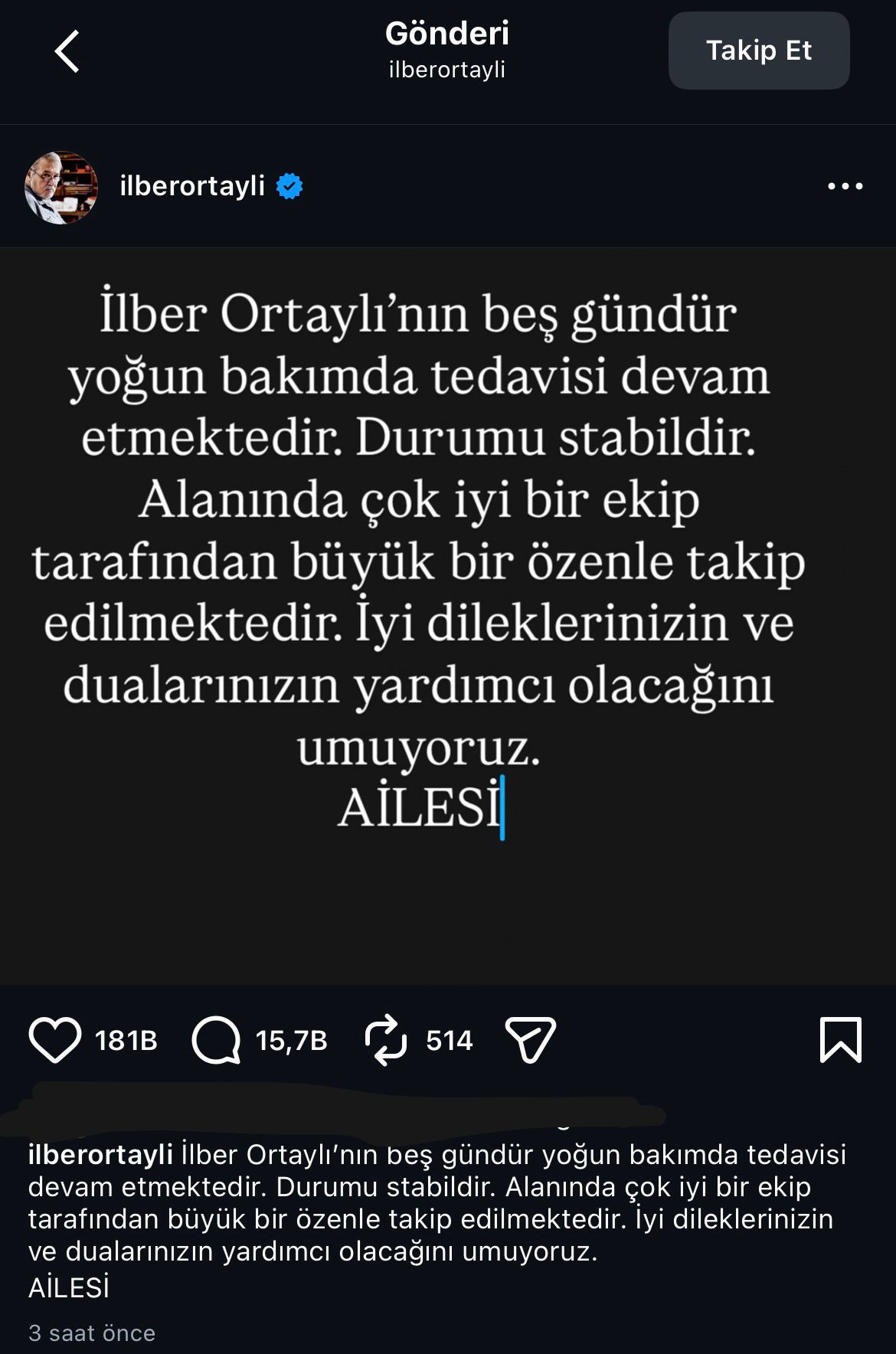 Ortaylı sosyal medya hesabından yaptığı paylaşımında, "Sevgili okurlarım, Ufak bir rahatsızlık nedeniyle kontrol amaçlı hastaneye geldim. Kısa sürede taburcu edileceğim. Arayan, soran tüm dostlara teşekkür ediyorum. Endişelenmenizi gerektirecek bir durum yok. Hepinize sağlıklı günler dilerim" açıklamasında bulunmuştu.