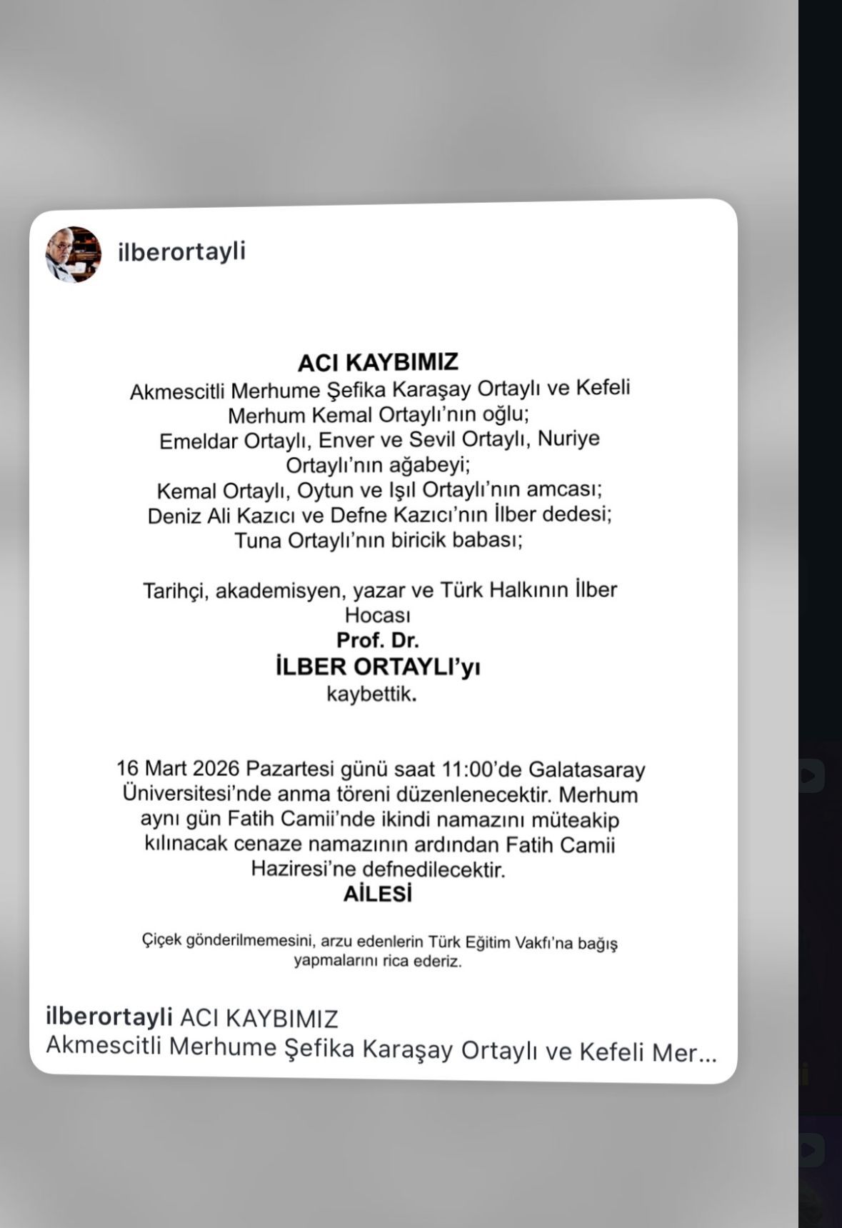 İlber Ortaylı için ilk törenin akademik camiada gerçekleştirileceği bildirilirken, aile tarafından X hesabı üzerinden yapılan duyuruda şu ifadelere yer verildi: "ACI KAYBIMIZ Akmescitli Merhume Şefika Karaşay Ortaylı ve Kefeli Merhum Kemal Ortaylı’nın oğlu; Emeldar Ortaylı, Enver ve Sevil Ortaylı, Nuriye Ortaylı’nın ağabeyi; Kemal Ortaylı, Oytun ve Işıl Ortaylı’nın amcası; Deniz Ali Kazıcı ve Defne Kazıcı’nın İlber dedesi; Tuna Ortaylı’nın biricik babası; Tarihçi, akademisyen, yazar ve Türk Halkının İlber Hocası Prof. Dr. İLBER ORTAYLI’yı kaybettik. 16 Mart 2026 Pazartesi günü saat 11:00’de Galatasaray Üniversitesi’nde anma töreni düzenlenecektir. Merhum aynı gün Fatih Camii’nde ikindi namazını müteakip kılınacak cenaze namazının ardından Fatih Camii Haziresi’ne defnedilecektir."