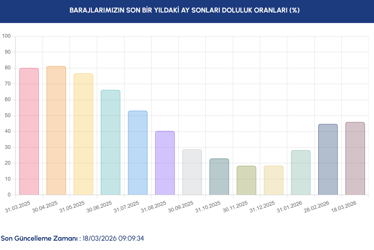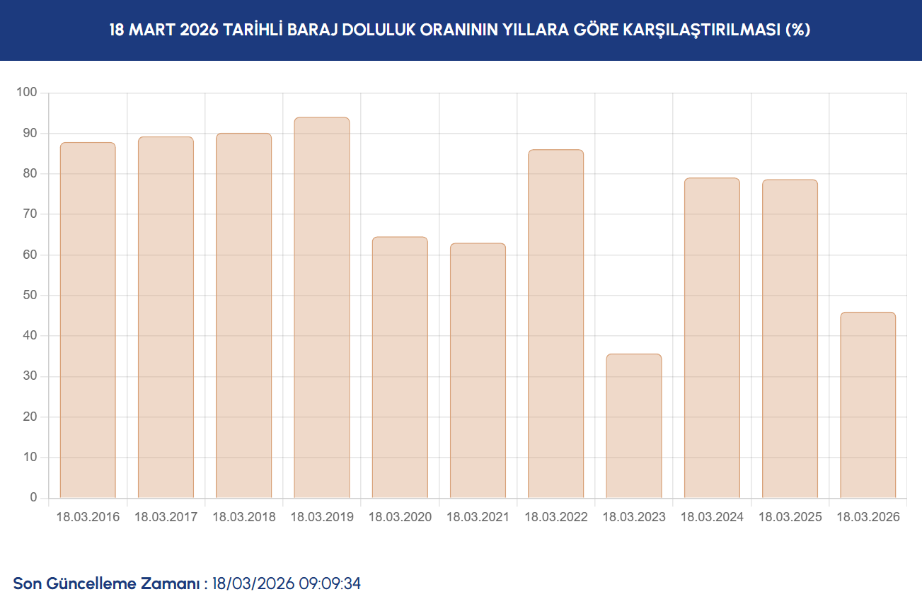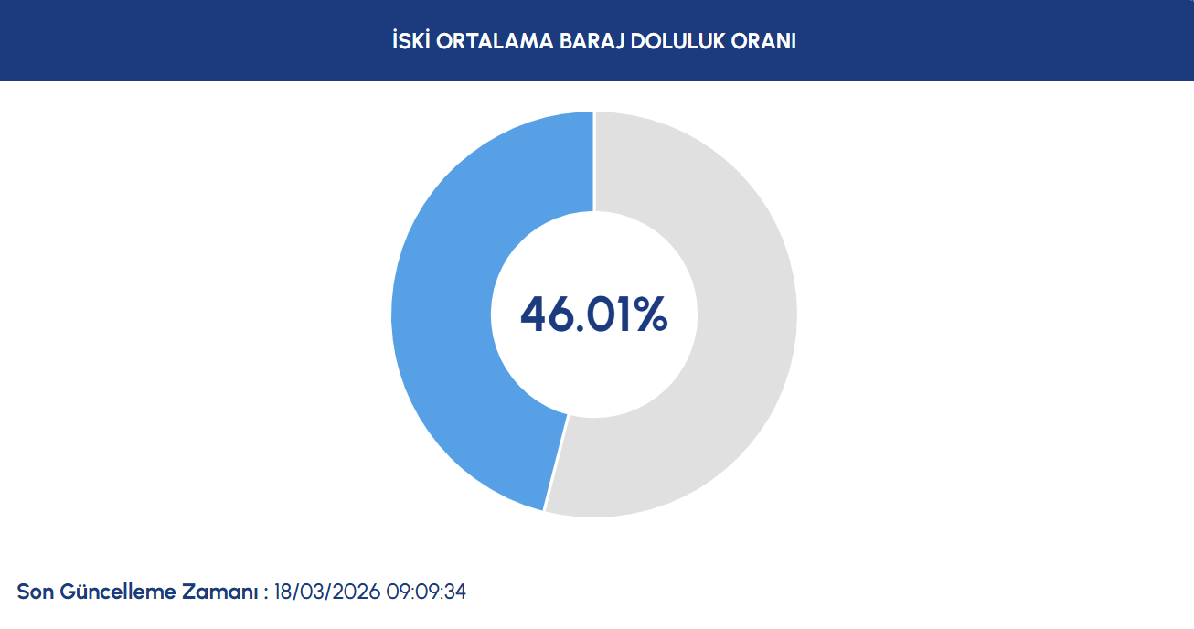 İstanbul Su ve Kanalizasyon İdaresi (İSKİ) tarafından paylaşılan veriler doğrultusunda İstanbul'da barajların su seviyesi güncellendi. Kış aylarında İstanbul'a beklenen yağışın olmaması nedeniyle barajlarda beklenen doluluk oranına ulaşılamadı. 18 Mart 2026 verilerine göre İstanbul'daki barajların doluluk oranının yüzde 46 olduğu belirtildi.