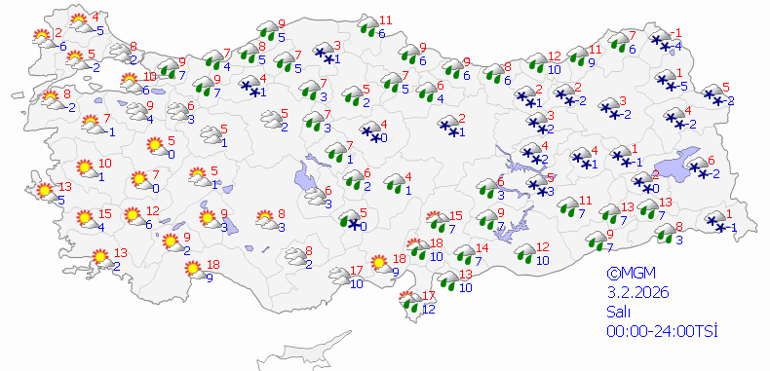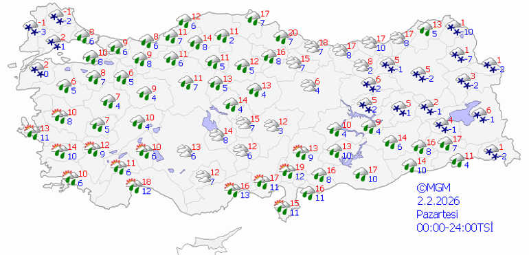 Tahminlere göre pazartesi günü hava sıcaklıklarının en düşük 1, en yüksek 5 derece olacağı, salı günü ise en düşük 1, en yüksek 4 derece seviyelerinde seyredeceği bildirildi. Çarşamba günü havanın parçalı ve az bulutlu geçmesi, sıcaklıkların ise en düşük sıfır, en yüksek 7 derece olması bekleniyor.