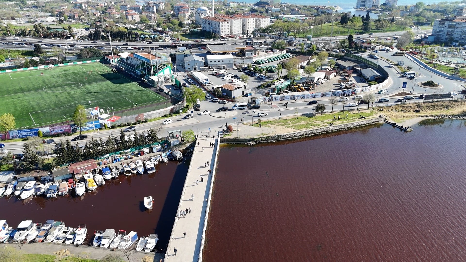 Gölün Marmara Denizi ile buluştuğu kritik bölgede suyun rengi, aniden koyu bir kırmızıya dönüştü. Suyun üzerindeki bu alışılagelmişin dışındaki tabaka, bölge sakinleri arasında büyük bir endişe ve kirlilik korkusu yarattı. Gölün kıyı şeridini boydan boya saran bu renk değişimi, durumun ciddiyetini gözler önüne seriyor.