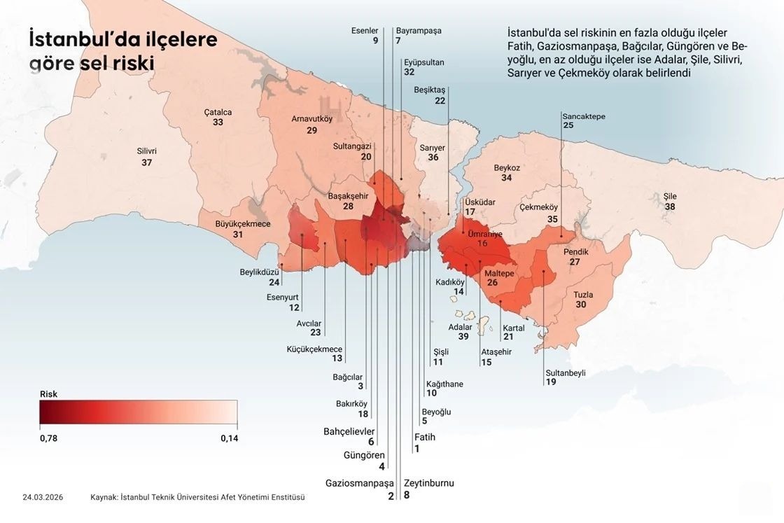 İstanbul Teknik Üniversitesi (İTÜ) ve İstanbul Büyükşehir Belediyesi’ne bağlı Afet Koordinasyon Merkezi (AKOM) işbirliğiyle yapay zeka kullanılarak megakentin sel riski haritası oluşturuldu. Peki, en riskli ilçeler hangileri? Detaylar haberimizde...