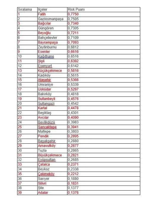 Yapay zekanın sel riskinin en fazla olduğu ilçeler listesine göre; sırasıyla Fatih, Gaziosmanpaşa, Bağcılar, Güngören ve Beyoğlu. En az olduğu ilçelerse Adalar, Şile, Silivri, Sarıyer ve Çekmeköy oldu.
