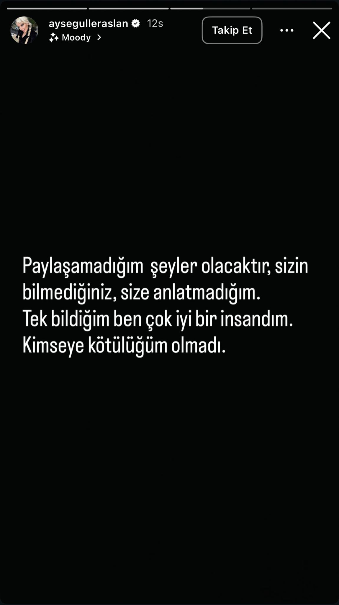 Eraslan, paylaşımında, "Paylaşmadığım şeyler vardır; sizin bilmediğiniz, size anlatmadığım… Tek bildiğim, ben çok iyi bir insandım. Kimseye kötülüğüm olmadı." sözlerine yer verdi.