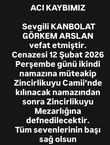 Sanatçının cenaze programına dair ayrıntıların yer aldığı açıklamada, törenin ikindi namazını müteakip gerçekleştirileceği belirtildi. Hicran Akın, paylaşımında şu bilgilere yer verdi: "Sevgili Kanbolat Görkem Arslan vefat etmiştir. Cenazesi 12 Şubat 2026 Perşembe günü ikindi namazının ardından Zincirlikuyu Camii'nde kılınacak ve Zincirlikuyu Mezarlığı'na defnedilecektir. Tüm sevenlerinin başı sağ olsun."