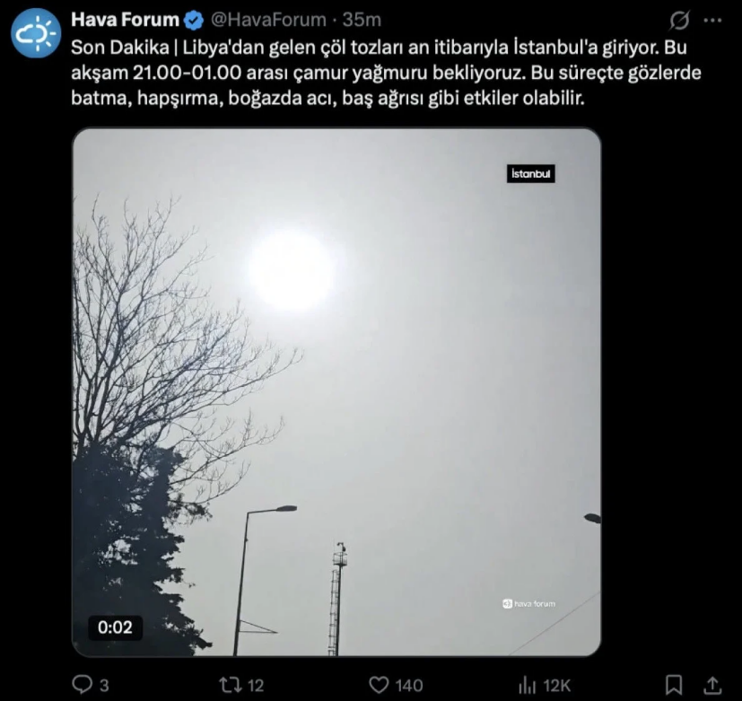 Hava Forum tarafından yapılan paylaşımda, beklenen toz taşınımı ve çamur yağışının yol açabileceği fiziksel belirtilere yönelik, "Libya'dan gelen çöl tozları an itibarıyla İstanbul'a giriyor. Bu akşam 21.00-01.00 arası çamur yağmuru bekliyoruz. Bu süreçte gözlerde batma, hapşırma, boğazda acı, baş ağrısı gibi etkiler olabilir." ifadeleri kullanıldı. Uzmanlar, toz partiküllerinin solunum yolu üzerindeki baskısı nedeniyle yaşanabilecek bu etkilerin, toz bulutlarının dağılmasına kadar devam edebileceğini kaydediyor.