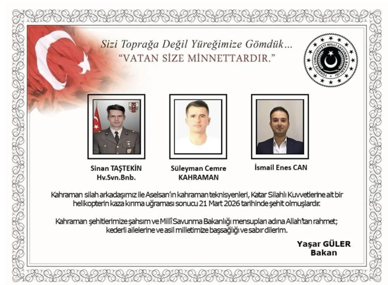 Katar-Türk Birleşik Müşterek Kuvvet Komutanlığı bünyesinde eğitim faaliyetleri kapsamında görev yapan bir helikopterin dün kaza yapması sonucu Hava Savunma Binbaşı Sinan Taştekin ve ASELSAN personeli Süleyman Cemre Kahraman, İsmail Enes Can şehit oldu.