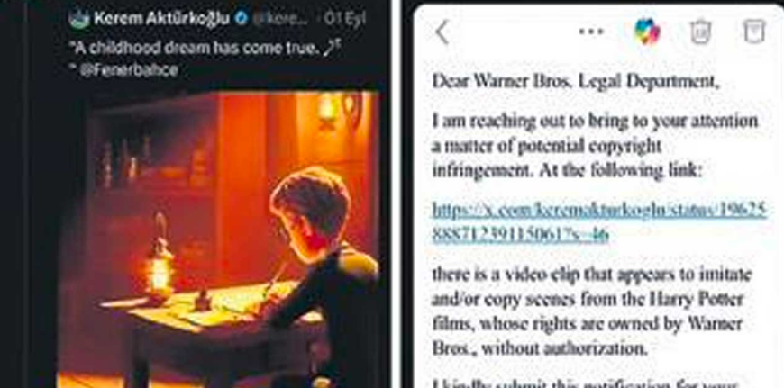 Söz konusu taraftarın, Kerem Aktürkoğlu’nun filmle ilgili bir paylaşımını alıntılayarak Warner Bros’u etiketlediği ve şirkete bir uyarı mesajı gönderdiği aktarıldı. Taraftar mesajında, "Olası bir telif hakkı ihlali konusunu dikkatinize sunmak için yazıyorum. Aşağıdaki bağlantıda yer alan bu bölüm, Kerem Aktürkoğlu'nun Harry Potter filmlerinden bir diziyi taklit etmek ve/veya kopyalamak için kullandığı bir video kliptir ve hakları Warner Bross.'a aittir. Bu bildirimi incelemeniz ve uygun gördüğünüz her türlü işlem için göndermenizi rica ediyorum" ifadelerini kullandı.