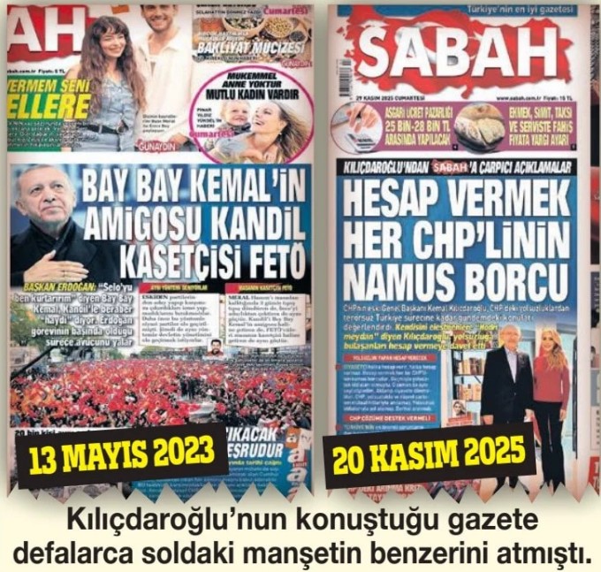 AK Parti hükümetine yakınlığıyla bilinen Sabah gazetesi, 14 Mayıs 2023 seçimlerinden bir gün önce “Bay bay Kemal’in amigosu Kandil, kasetçisi FETÖ” manşeti atmıştı.
