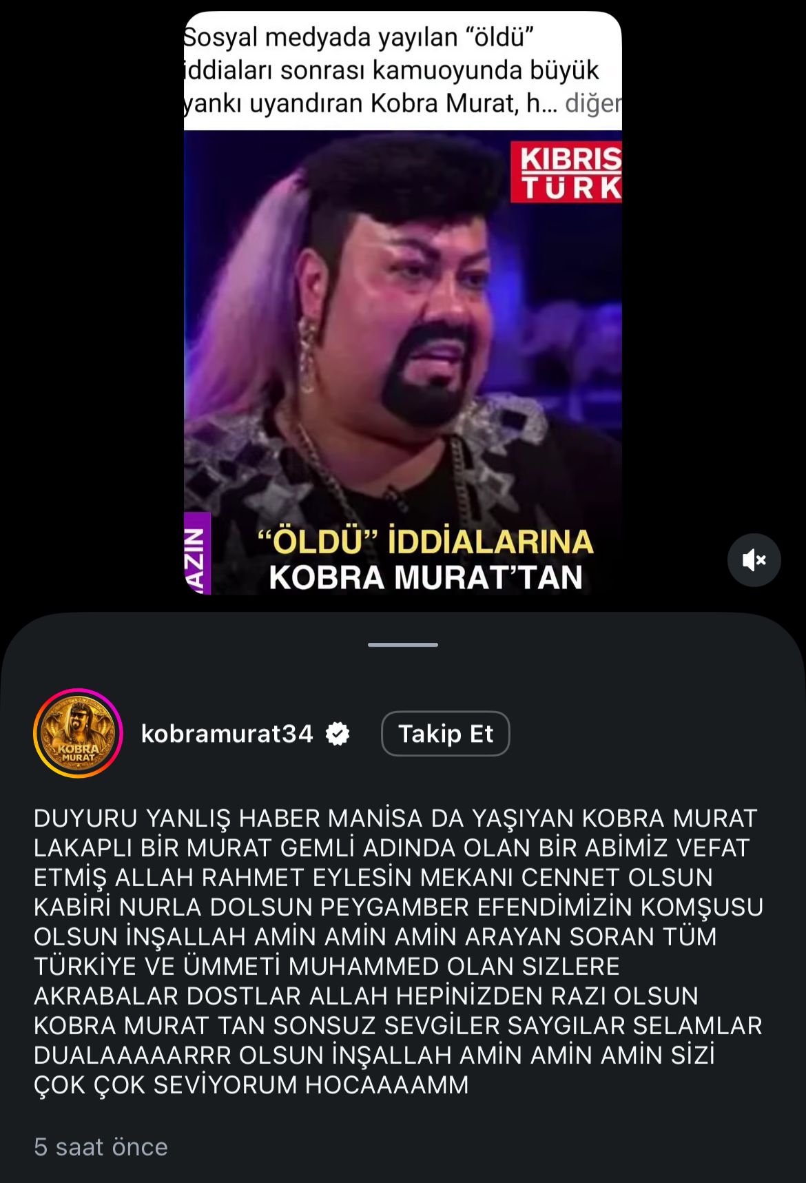 "Romanların Prensi" olarak bilinen Kobra Murat, sosyal medya hesabından yaptığı açıklamada hakkındaki 'ölüm' iddiasını yalanladı. Kobra Murat paylaşımında “Duyuru yanlış haber. Haberdeki abimizin de lakabı ' Kobra Murat' imiş. Manisa'da evinde ölü bulunmuş. Allah rahmet eylesin mekanı cennet olsun, kabri nurla dolsun. Peygamber efendimizin komşusu olsun inşallah" ifadelerini kullandı.