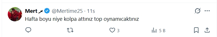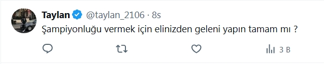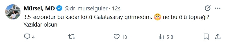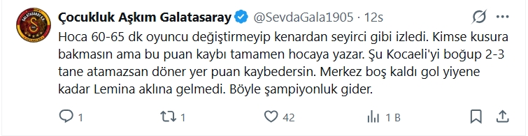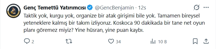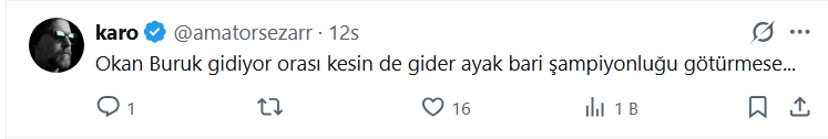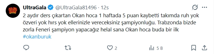 Özellikle maçın ikinci yarısında etkisiz bir performans gösteren sarı kırmızılı ekibe taraftarlarından tepki geldi. Sosyal medyadan Teknik Direktör Okan Buruk’u eleştiren Galatasaraylılar, ‘artık şampiyonluk hayal’, ‘istifa da bir hizmettir’, ‘Osimhen olmadan rezil futbol’ gibi yorumlar yaptı.