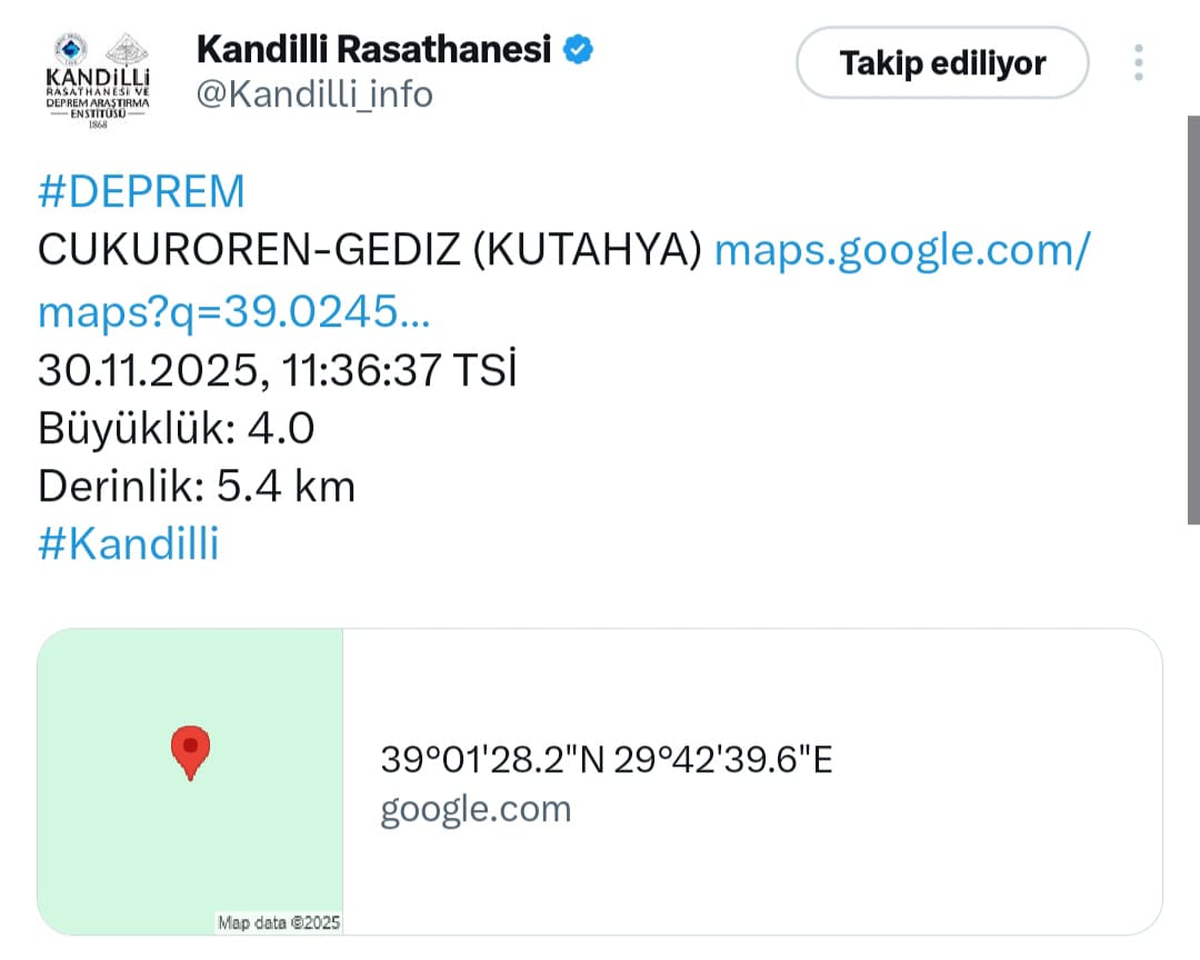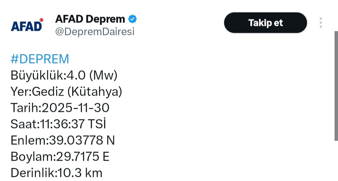 Kütahya’ya bağlı Gediz ilçesinde bugün saat 11.36'da 4.0 büyüklüğünde deprem meydana geldi. Depremde herhangi bir can ve mal kaybının yaşandığı belirtildi.