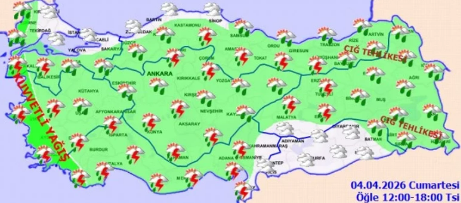 Meteoroloji Genel Müdürlüğü, hafta sonu boyunca ülke genelinde sağanak yağışın etkili olacağını duyururken; kuvvetli rüzgar, toz taşınımı ve çığ tehlikesine karşı vatandaşları uyararak 13 il için sarı kodlu alarm verdi.