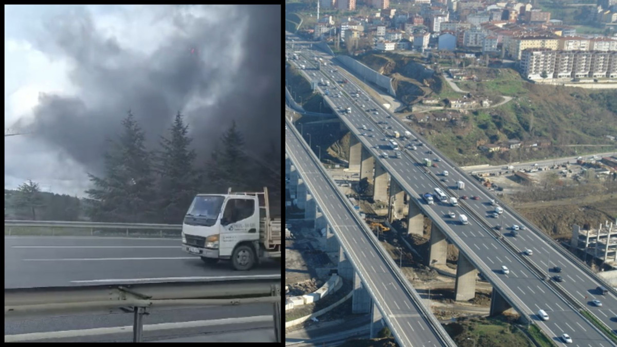 Kuzey Marmara Otoyolu'nda bulunan Hasdal kavşağında, bilinmeyen bir nedenle göğe yükselen duman vatandaş kamerasına yansıdı.
