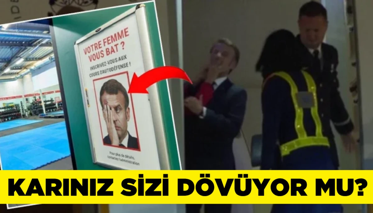 Macron’un görselinin yer aldığı afişte, “Karınız sizi dövüyor mu? Kendini savunma derslerimize katılın!” sloganı dikkat çekti.