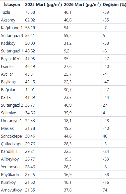 Açıklanan verilere göre, İstanbul genelinde mart ayında ortalama PM10 değeri metreküp başına 30,6 mikrogram, 2025 yılının aynı döneminde 40,3 mikrogram seviyesindeydi. Böylece partikül madde kaynaklı hava kirliliğinde önceki seneye göre yüzde 24 azaldı.