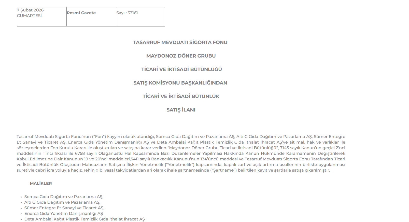 Yapılan satış ilanında “Tasarruf Mevduatı Sigorta Fonu’nun (“Fon”) kayyım olarak atandığı, Somca Gıda Dağıtım ve Pazarlama AŞ, Altı G Gıda Dağıtım ve Pazarlama AŞ, Sümer Entegre Et Sanayi ve Ticaret AŞ, Enerca Gıda Yönetim Danışmanlığı AŞ ve Deta Ambalaj Kağıt Plastik Temizlik Gıda İthalat İhracat AŞ’ye ait mal, hak ve varlıklar ile sözleşmelerden Fon Kurulu Kararı ile oluşturulan ve satışına karar verilen “ Maydonoz Döner Grubu Ticari ve İktisadi Bütünlüğü”, 7145 sayılı Kanun’un geçici 2’nci maddesinin 1’inci fıkrası ile 6758 sayılı Olağanüstü Hal Kapsamında Bazı Düzenlemeler Yapılması Hakkında Kanun Hükmünde Kararnamenin Değiştirilerek Kabul Edilmesine Dair Kanunun 19 ve 20’nci maddeleri,5411 sayılı Bankacılık Kanunu’nun 134’üncü maddesi ve Tasarruf Mevduatı Sigorta Fonu Tarafından Ticari ve İktisadi Bütünlük Oluşturan Mahcuzların Satışına İlişkin Yönetmelik (“Yönetmelik”) kapsamında, kapalı zarf ve açık artırma usullerinin birlikte uygulanması suretiyle cebri icra yoluyla haciz, rehin gibi yasal takyidatlardan ari olarak ihale şartnamesinde (“Şartname”) belirtilen kayıt ve şartlarla satışa çıkarılmıştır” ifadelerine yer verildi.
