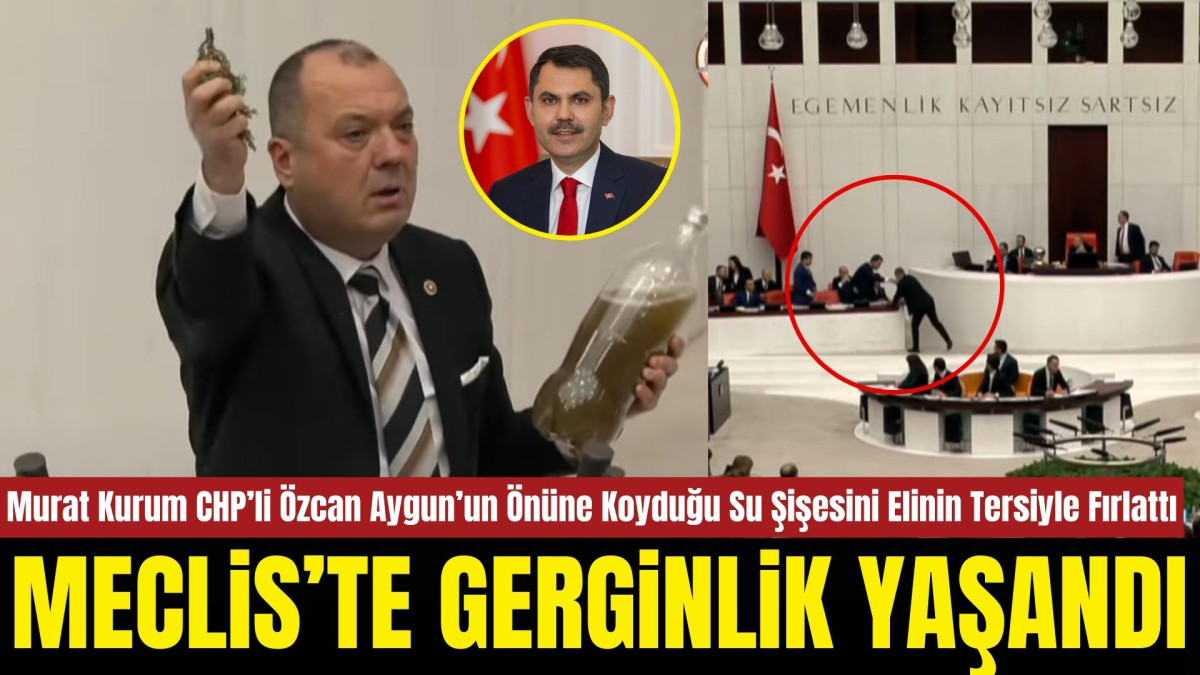 Bakanların Meclis'te sık sık yaratmış olduğu gergin anlara bir yenisi daha eklendi. Bakan Murat Kurum, CHP’li Özcan Aygun tarafından Ergene Nehri’nden alınarak önüne koyulan su şişesini elinin tersiyle fırlattı. Kurum'un beklenmedik hareketiyle Meclis bir anda karıştı.