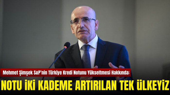 Hazine ve Maliye Bakanı Mehmet Şimşek, kredi derecelendirme kuruluşu S&P'nin Türkiye'nin kredi notunu yükseltmesi kararı hakkında açıklama yaptı. Şimşek, "Notu iki kademe artırılan tek ülkeyiz" dedi.
