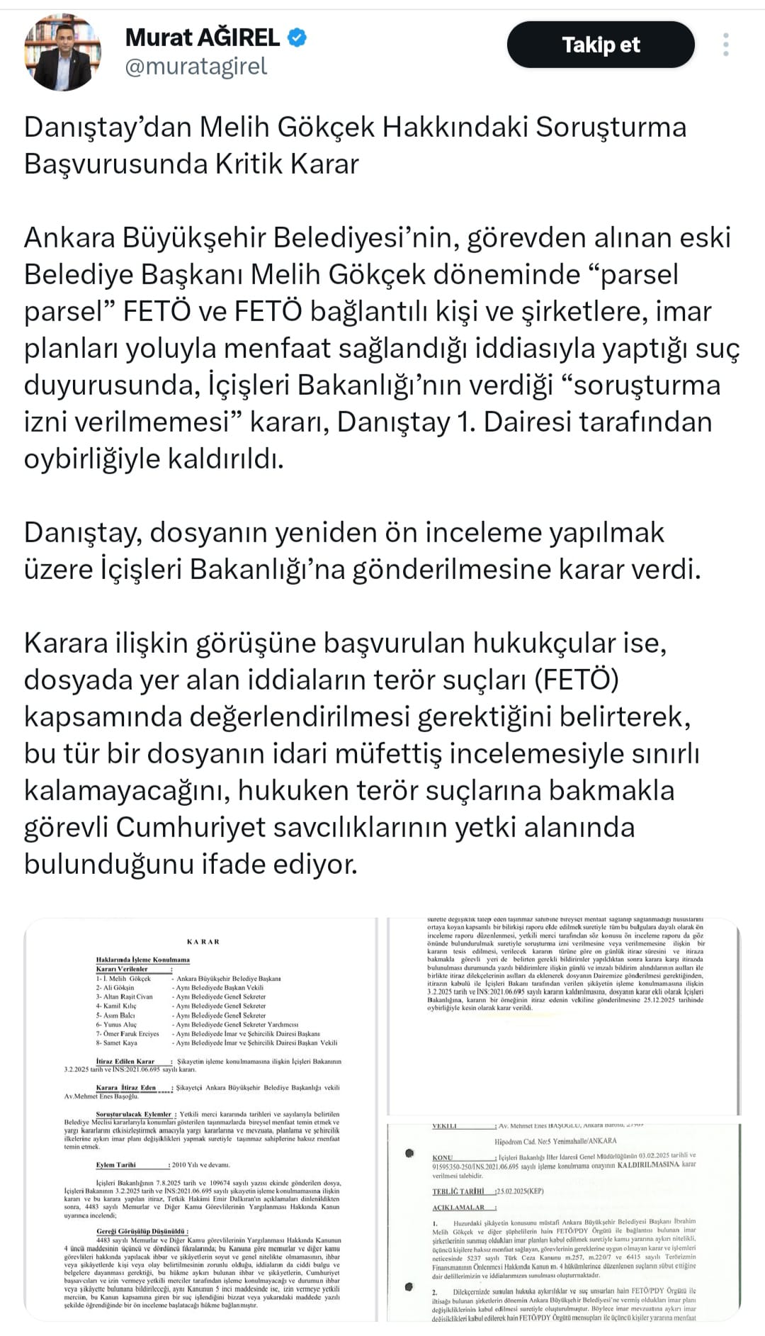Gazeteci Murat Ağırel’in haberine göre, Ankara Büyükşehir Belediyesi tarafından eski Belediye Başkanı Melih Gökçek döneminde FETÖ ve FETÖ bağlantılı kişi ve şirketlere, imar planları yoluyla menfaat sağlandığı iddiasıyla yapılan suç duyurusunda, İçişleri Bakanlığı’nın verdiği “soruşturma izni verilmemesi” kararı, Danıştay 1. Dairesi tarafından oy birliğiyle kaldırıldı.