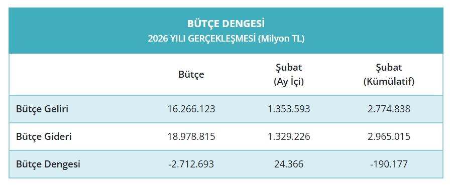 Hazine ve Maliye Bakanlığı ‘Şubat 2026 dönemi Merkezi Yönetim Bütçe’ verilerini kamuoyuyla paylaştı. Peki, merkezi yönetim bütçe giderleri ne kadar, bütçe gelirleri ne kadar, bütçe fazla verdi mi? İşte detaylar...
