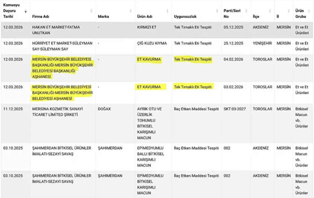 Mersin Büyükşehir Belediyesi'ne ait aşevinde dağıtılan kavurmada yarış atlarına takılan elektronik kimlik çipi çıktı. Şikayet üzerine yapılan laboratuvar analizleri ile kavurmada tek tırnaklı hayvan eti (at, eşek) bulunduğunu tespit edildi.