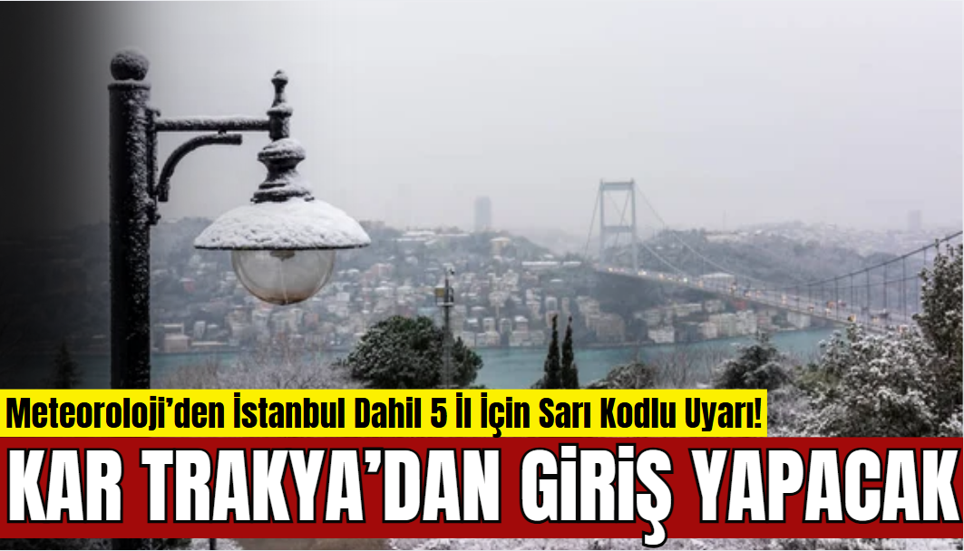 Meteoroloji, bugün ve yarın İstanbul dahil 5 kent için sarı kodlu uyarı verdi. Yarın İstanbul dahil, yurt genelinde sıcaklıklar 5 derece düşecek. Kar yağışı yarın itibarıyla Trakya’dan yurda giriş yapacak. Ankara ve Bolu başta olmak üzere, pazartesi günü pek çok ilde kar yağışı etkili olacak. İşte detaylar…