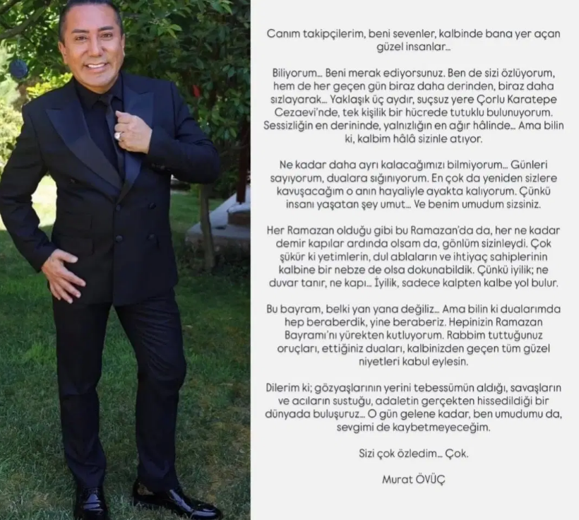 Sosyal medya paylaşımlarıyla tanınan ve yürütülen bir soruşturma kapsamında 1 yıldan 3 yıla kadar hapis istemiyle yargılanan Murat Övüç, Çorlu Karatepe Cezaevi’nden sevenlerine seslendi. Tutukluluk süreci devam eden ünlü isim, Ramazan Bayramı vesilesiyle gönderdiği mesajda, parmaklıklar ardındaki yaşamına ve ruh haline dair çarpıcı ifadeler kullandı. Suçsuz olduğunu savunan Övüç, davasının seyrini beklediğini belirtti.