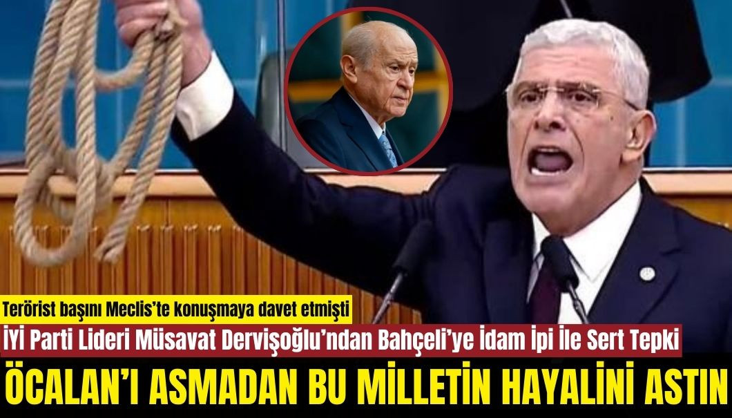 İYİ Parti grup toplantısında konuşan İYİ Parti Genel Başkanı Müsavat Dervişoğlu, PKK'nın elebaşı Abdullah Öcalan için 'gelsin TBMM'de DEM Grup Toplantısı'nda konuşsun' diyerek tepkilerin odağı olan Devlet Bahçeli'ye idam ipi fırlattı. Dervişoğlu, kürsüde yaptığı konuşmada eline aldığı idam ipini havaya kaldırarak "Öcalan'ı asamadan bu milletin hayalini astın. Al şimdi bu ipi başucuna as." ifadelerini kullandı.