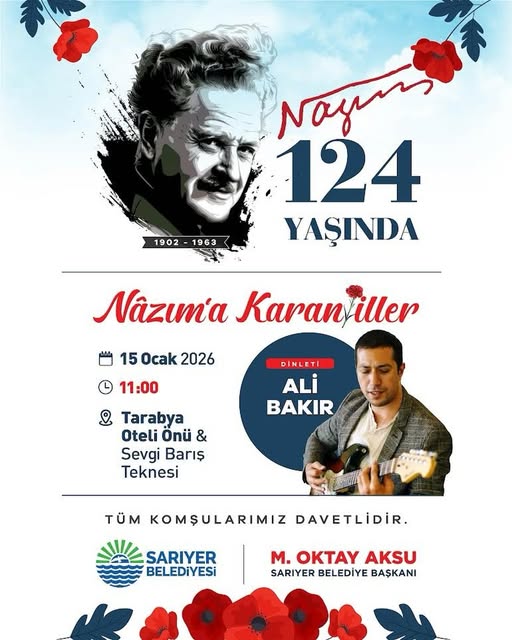 “Nazıma Karanfiller” başlığıyla gerçekleştirilecek anma programında; şiirler, anılar ve müzik eşliğinde Nâzım Hikmet’in mücadeleci ruhu ve edebi mirası bir kez daha yaşatılacak. Tarabya Oteli önünde yarın (15 Ocak 2026) saat 11:00'da başlayacak etkinlik kapsamında sanatçı Ali Bakır dinletisi de gerçekleştirilecek.
